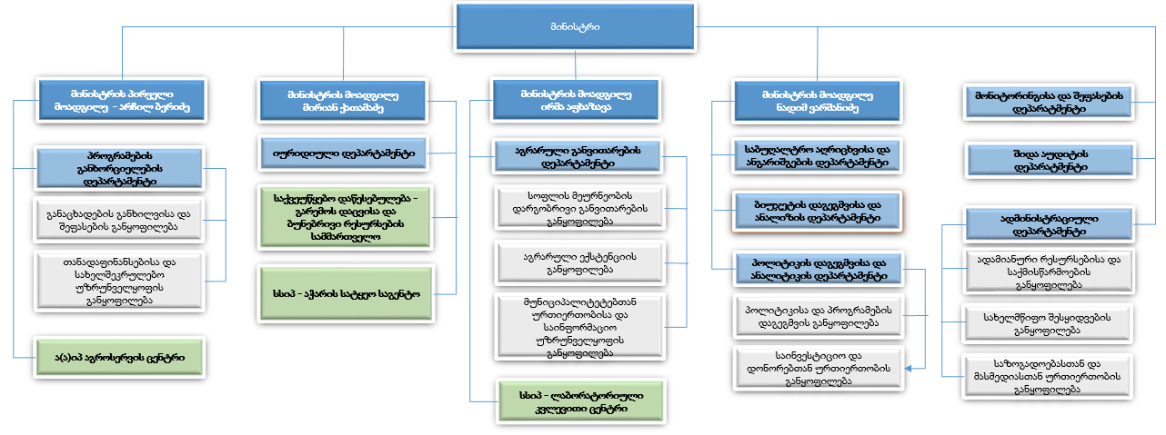 1. სამინისტროს მმართველობის სფეროში შედის გარემოს დაცვის, აგროსასურსათო, აგროგადამამუშავებელი, ნიადაგის ნაყოფიერების გაზრდის, მემცენარეობის, მეცხოველეობის, მეთევზეობის, აგროსაინჟინრო და ვეტერინარიის დარგები.